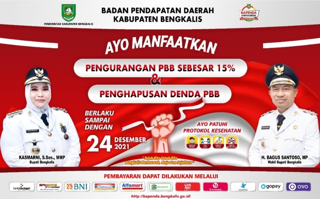 Sementara itu Plt Kepala Badan Pendapatan Daerah (Bapenda) Kabupate Bengkalis, Syahrudin SH MH, menjelaskan, perpanjangan penghapusan sanksi administrasi dan pengurangan Pajak Bumi Bangunan Perdesaan Perkotaan (PBB-P2) sebesar 15 persen, hingga 24 Desember 2021, sebagai upaya pemerintah membantu wajib pajak di musim pendemi Covid19 ini. Juga sebagai stimulus agar Pendapatan Asli Daerah meningkat.