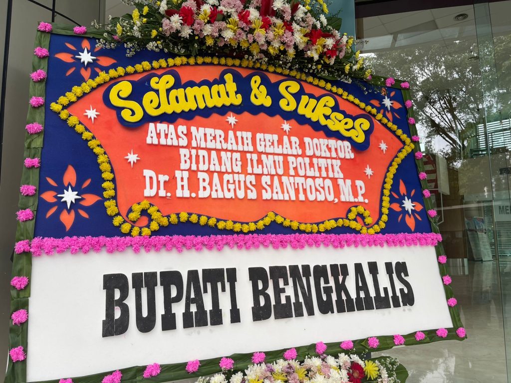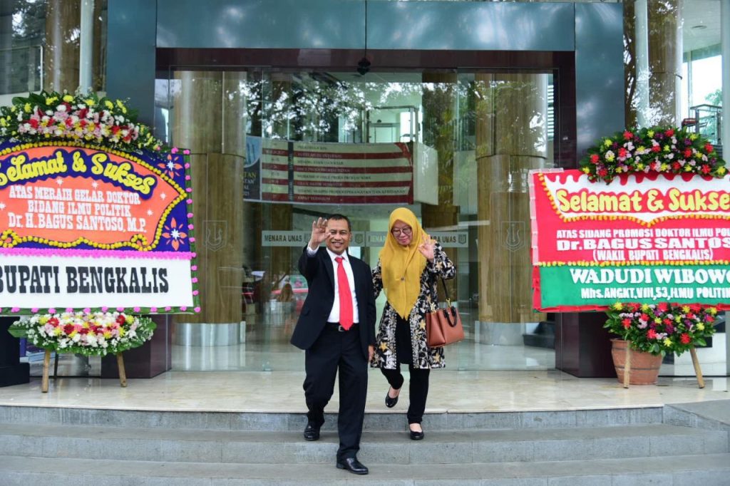 Bupati Bengkalis Kasmarni turut berbangga dan berbahagia seraya mengucapkan selamat dan sukses atas keberhasilan gelar akademis S-3 bidang ilmu politik yang di raih Wabup Bagus Santoso.