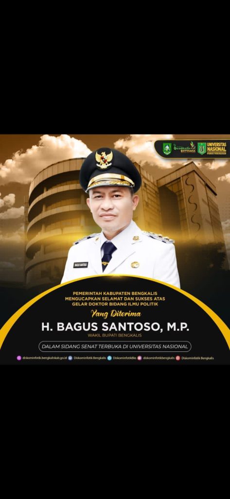BUALNEWS.COM — Bagus Santoso Wakil Bupati Bengkalis berhasil meraih gelar akademik yaitu Doktor (Dr) Bidang Ilmu Politik dari Universitas Nasional ( UNAS ) Jakarta. Setelah sukses mempertahankan tugas disertasi dengan judul Strategi Pemenangan Dalam Pemilu Legislatif dihadapan tim penguji pada acara sidang senat terbuka di Gedung Menara Unas Ragunan Jakarta, 1 Maret 2023.
