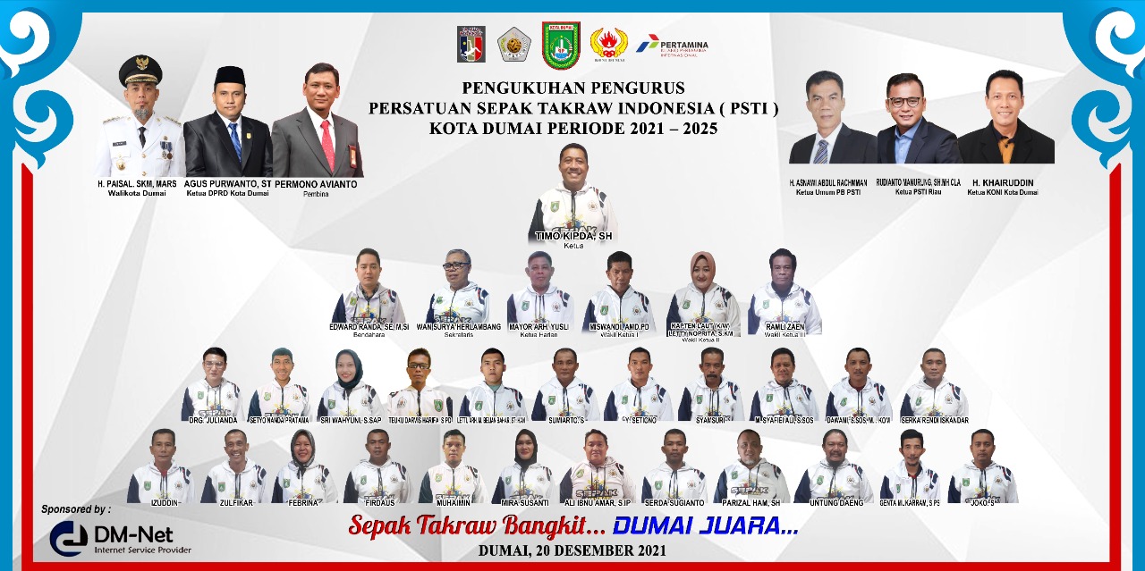 BUALNEWS.COM -- Besok, Senin (20-12-2021) Pengurus Persatuan Sepak Takraw Indonesia (PSTI) Kota Dumai periode 2021-2022 akan dilantik di Gedung Pendopo Sri Bunga Tanjung, Jalan Putri Tujuh, Kota Dumai.