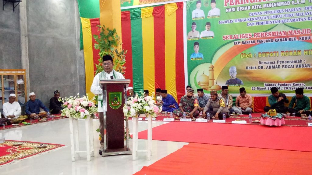 Sebelum mendengarkan ceramah agama tentang peringatan Isra Mikraj dan peringatan menyambut bulan Suci Ramadan oleh Rektor IAITF Dumai, Dr H Ahmad Rozai Akbar MH. Ada beberapa sambutan disampaikan yaitu dari ketua masjid dan panita pembangunan masjid, Datuk Kepenghuluan Rantau Panjang Kanan, Camat Kubu, Majelis Tinggi Kerapatan Adat Melayu Empat Suku Kenegerian Kubu diwakili Sekretaris DPH, Zulhaifi ST dan dilanjutkan dengan sambutan Ketua Yayasan IAITF Dumai dan penulis buku Tanah Ulayat Suku Hamba Raja Kenegerian Kubu, Dr HM Rizal Akbar M.Phil.